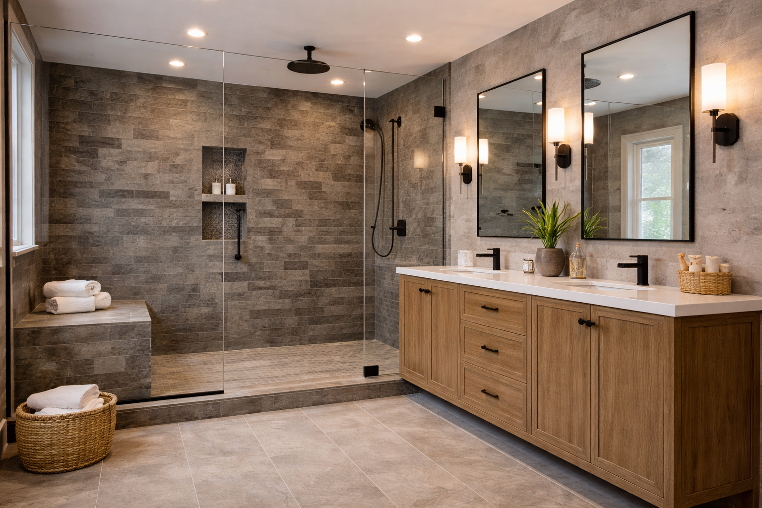 Complete bathroom remodels including layouts, finishes, fixtures, and elevated details.